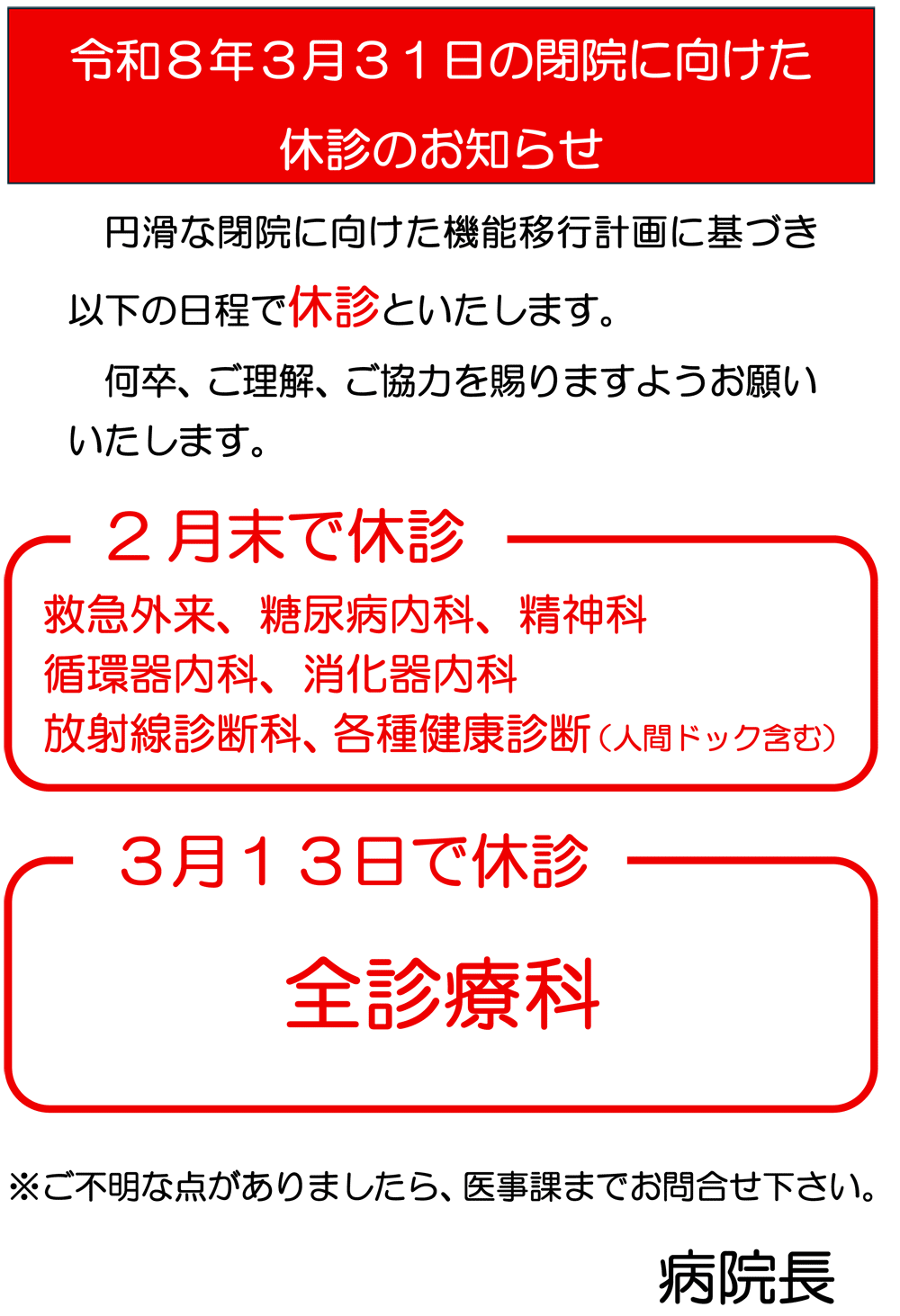 令和8年3月31日の閉院に向けた機能移行計画及び休診のお知らせについて